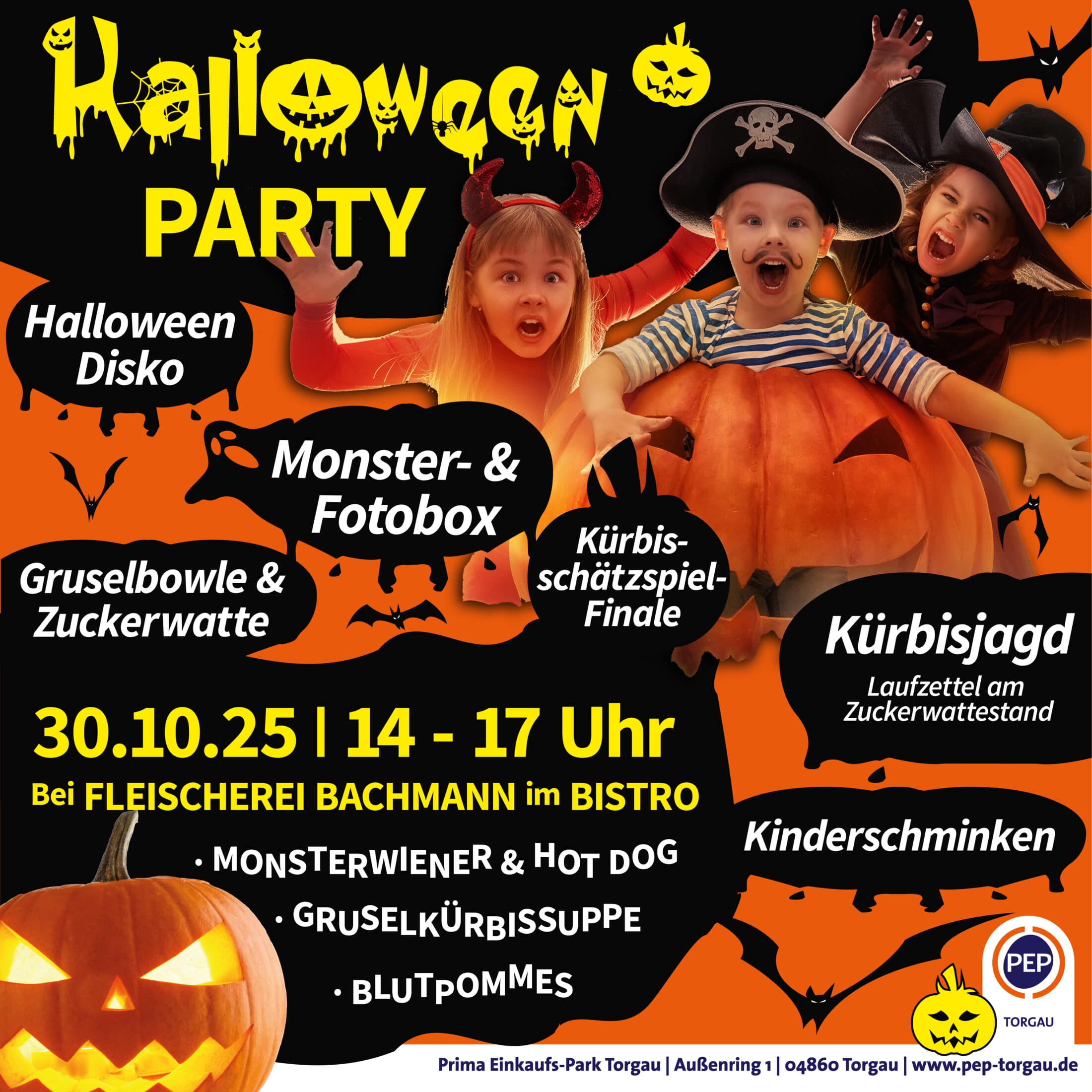 Am 30. Oktober 2025 verwandelt sich der PEP Torgau in eine gruselige Halloween-Welt für Groß und Klein. Von 14 bis 17 Uhr lädt die Fleischerei Bachmann im Bistro zu einer schaurig-schönen Party ein.